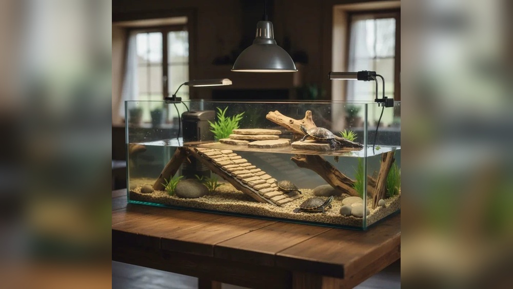 Turtle and tortoise setups require water areas for swimming and dry land for basking. Use shallow water for turtles and deep enough for swimming. Add UVB lights and heat lamps to regulate temperature. Ensure enclosure is escape-proof with sturdy walls.